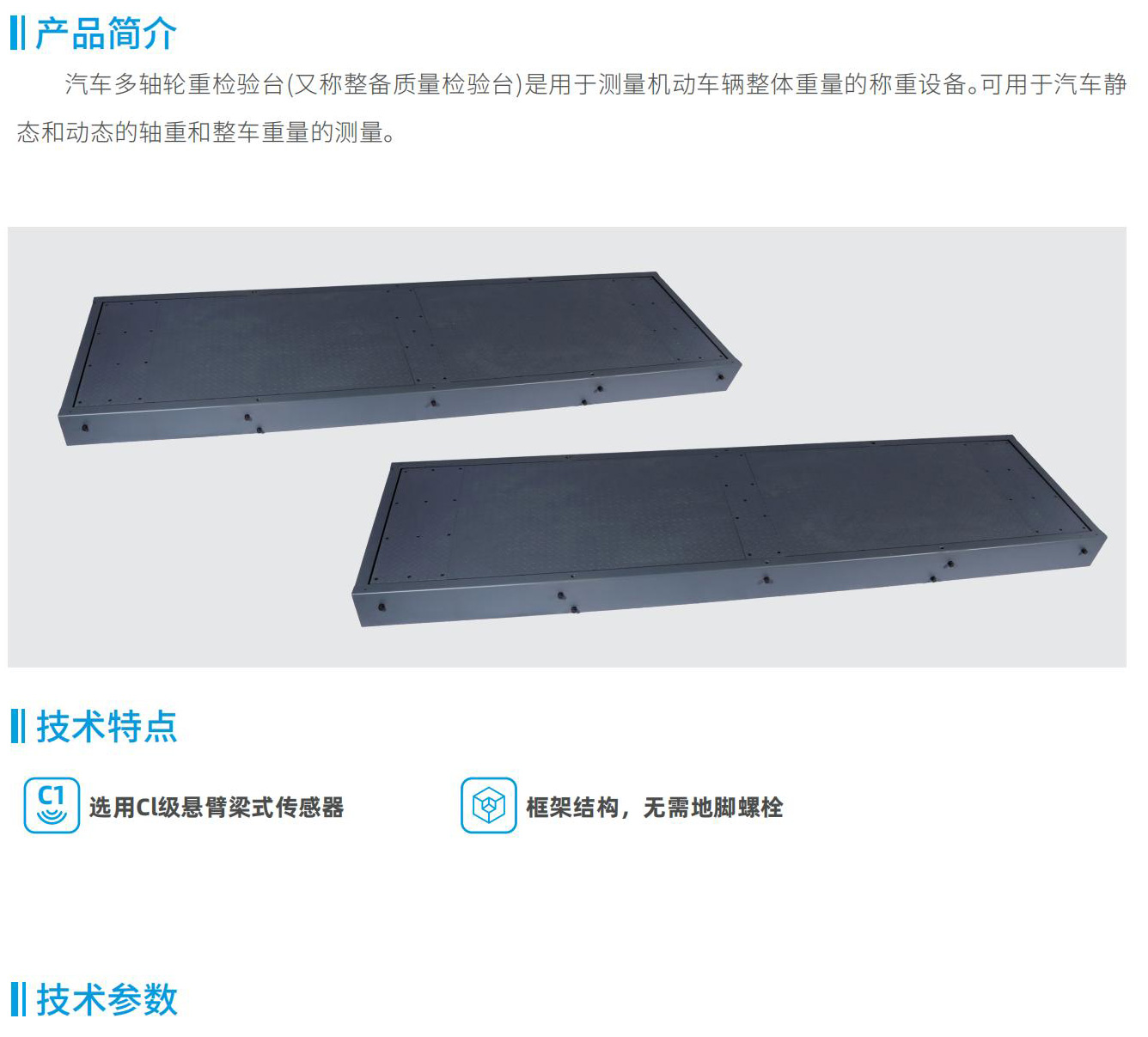 汽車多軸輪重檢驗(yàn)臺(tái)(又稱整備質(zhì)量檢驗(yàn)臺(tái))是用于測(cè)量機(jī)動(dòng)車輛整體重量的稱重設(shè)備??捎糜谄囲o態(tài)和動(dòng)態(tài)的軸重和整車重量的測(cè)量。